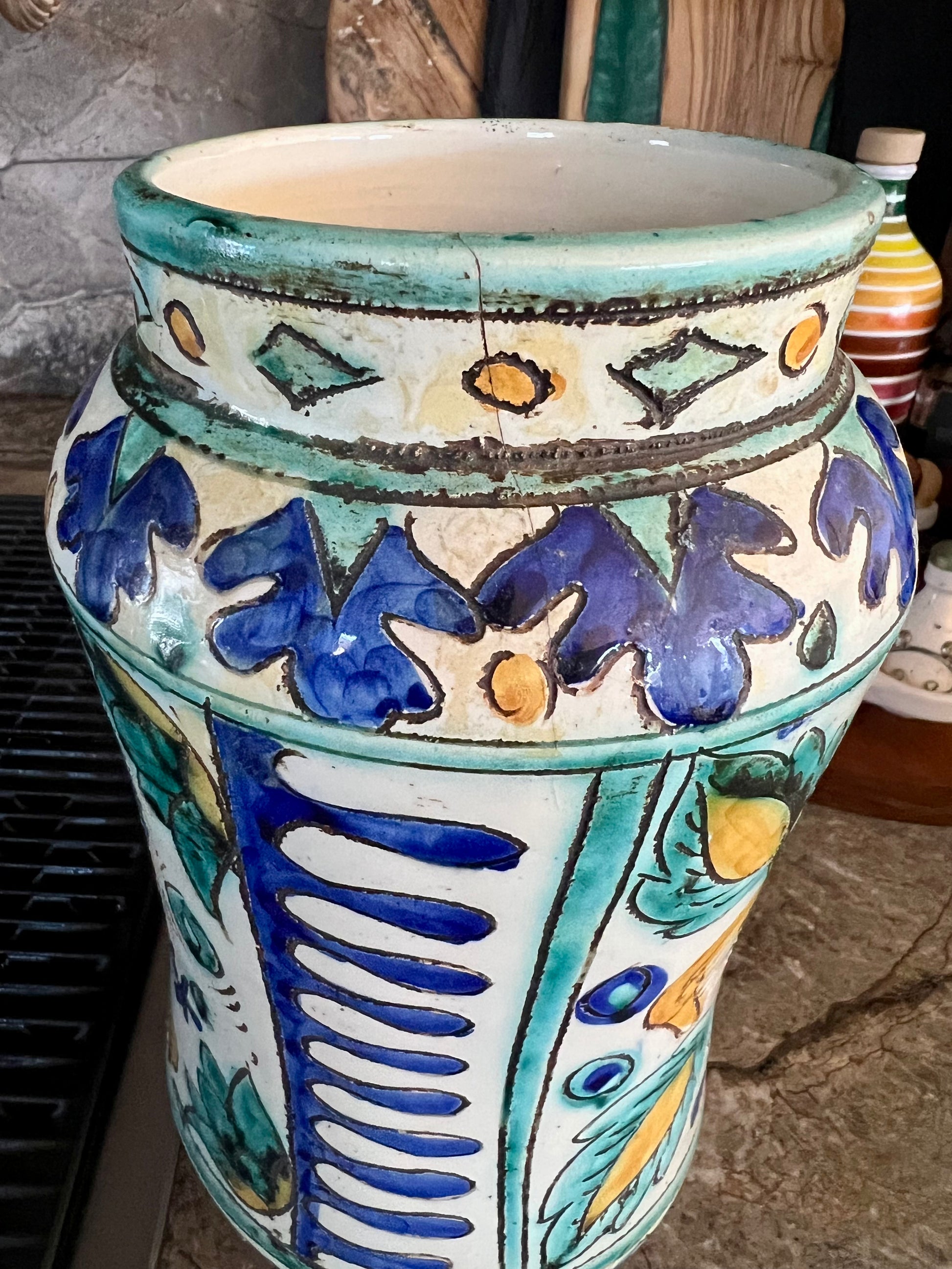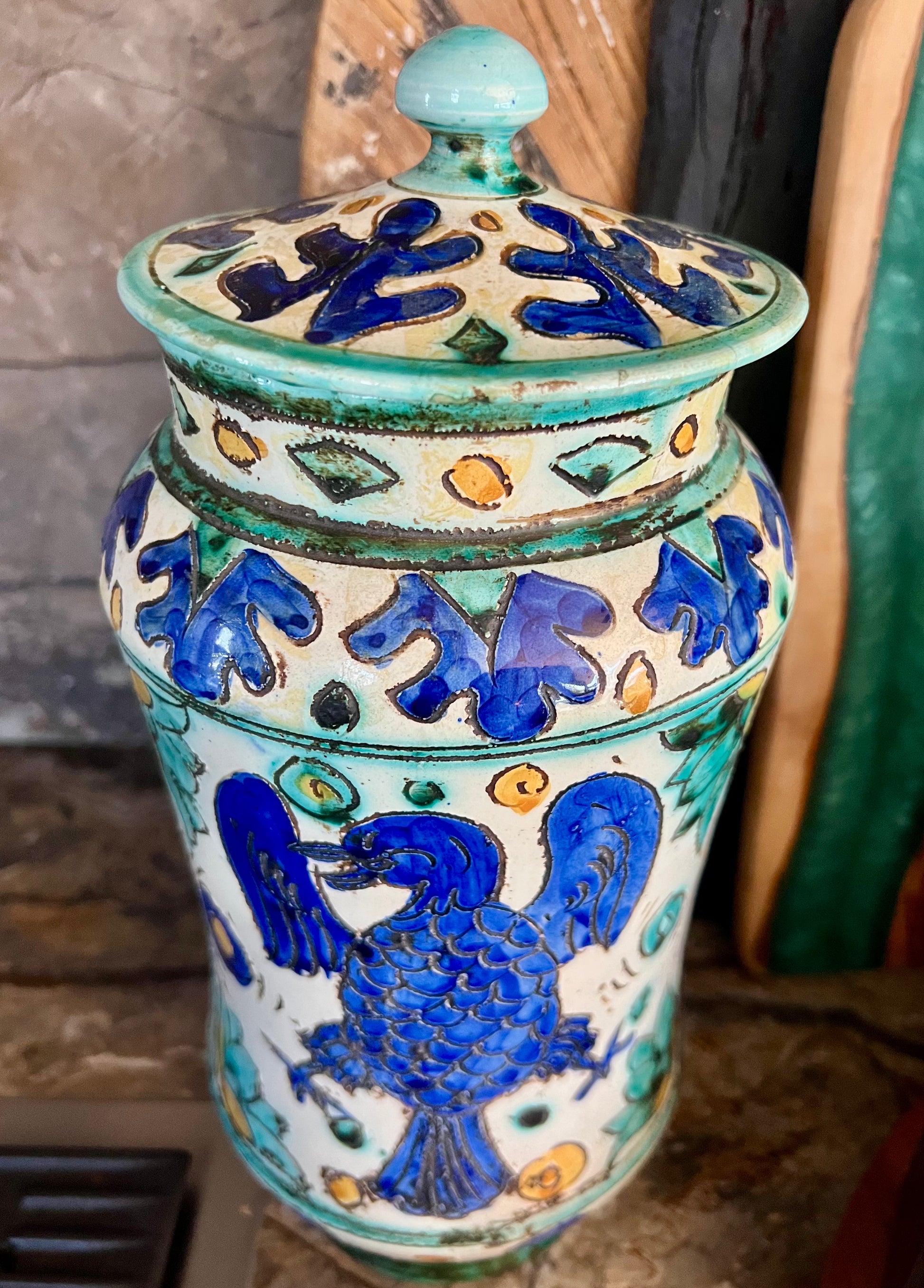 Traditionally used to store medicinal or culinary ingredients, this piece showcases classic Italian tin-glaze techniques, with floral and foliate motifs in vivid blue, green, and saffron hues.