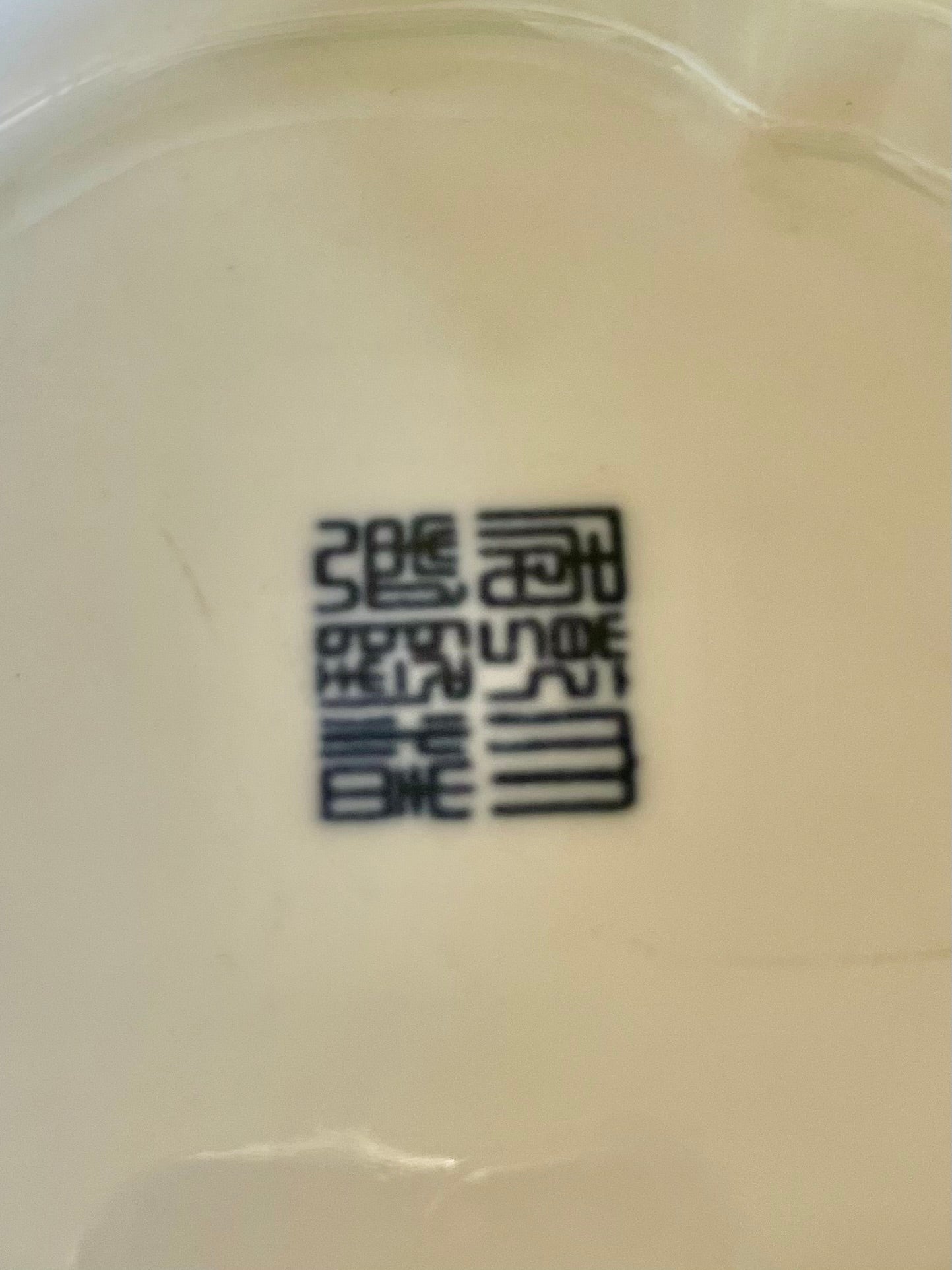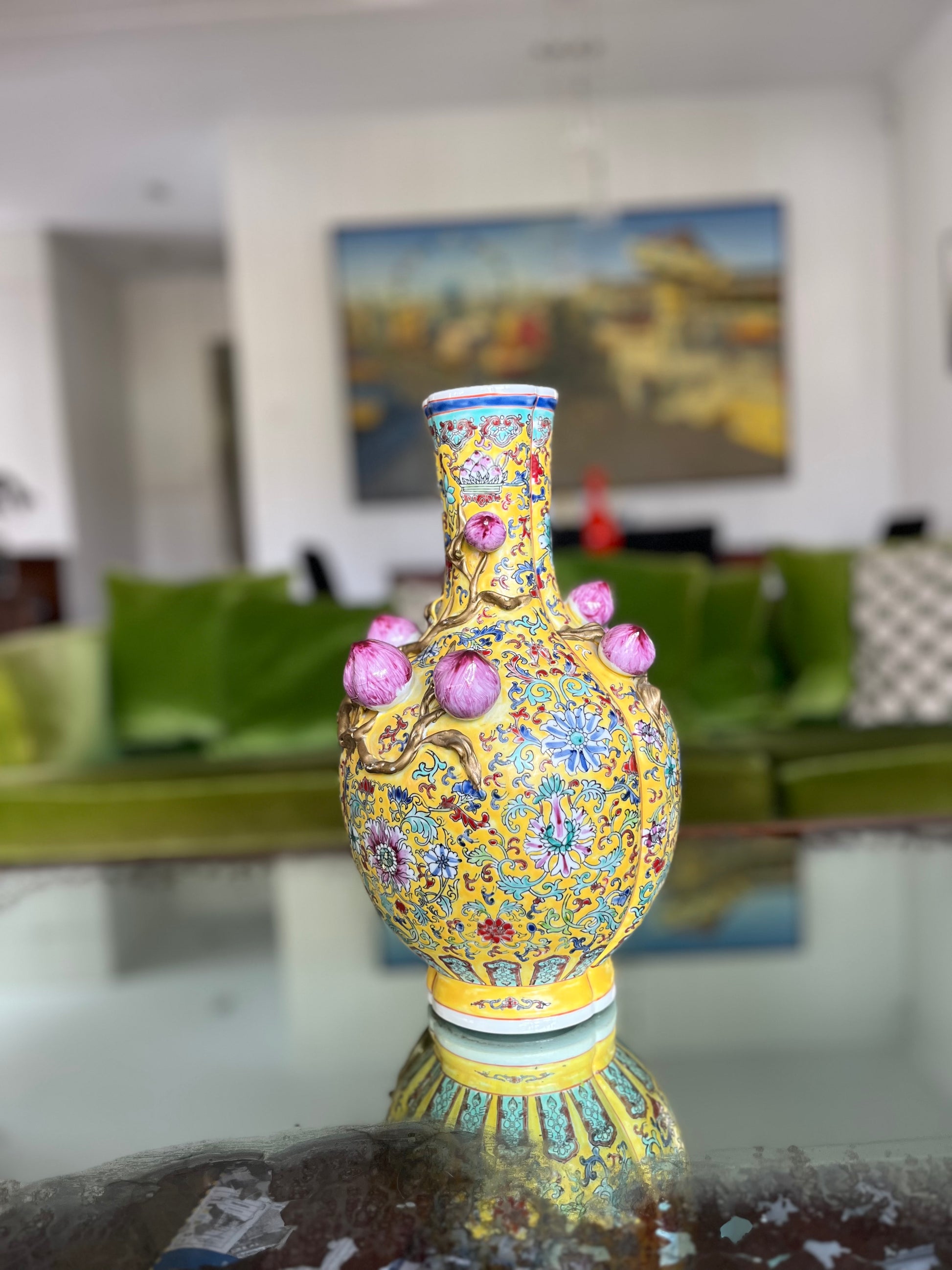 There are raised, applied elements (lotus flowers) that are in 3D clinging to “branches” that are sculptural. This decorative effect (mixing painted enamel and moulded relief was typical of Qing Dynasty).